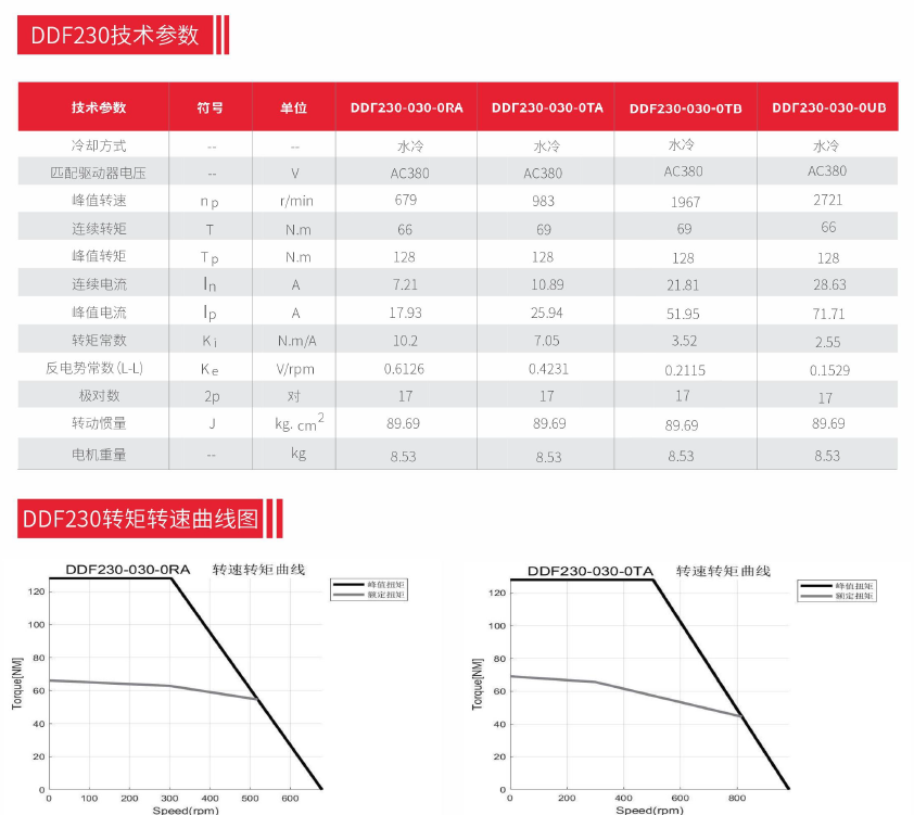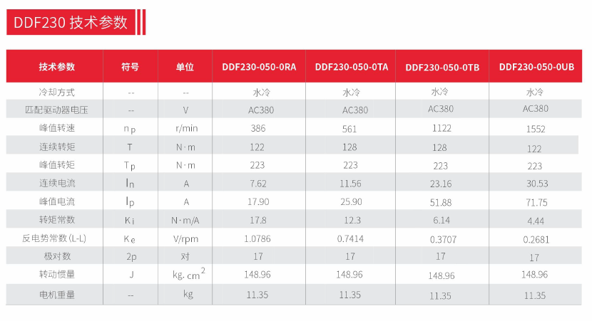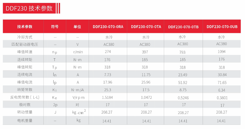 德瑪特水冷無(wú)框電機DDF230技術(shù)參數: