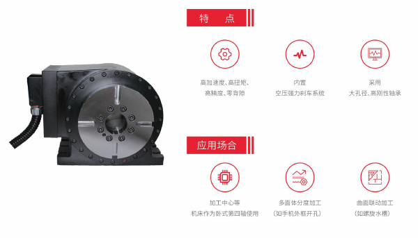 RTH系列數控臥式直驅轉臺采用了高動(dòng)態(tài)響應直驅電機,消除了傳動(dòng)部件帶來(lái)的磨損、間隙、彈性、滯后等問(wèn)題。主要應用于加工中心等機床作為臥式第四軸使用,實(shí)現如多面體分度加工(如手機外框開(kāi)孔),曲面聯(lián)動(dòng)加工(如螺旋水槽)